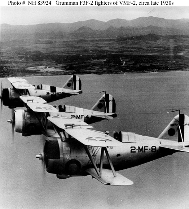 Photo #: NH 83924 Grumman F3F-2 Fighters, of Marine Fighting Squadron Two (VMF-2) Flying in formation, during the later 1930s. Planes are (from front to back) Bureau #s 0977, 0973 & 0979. Courtesy of the Naval Historical Foundation. Collection of Chief Boatswains Mate Ralph E. Turpin. U.S. Naval History and Heritage Command Photograph. Online Image: 85KB; 610 x 675 pixels |