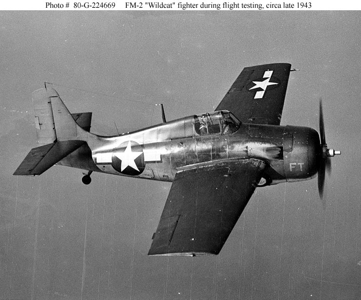 Photo #: 80-G-222824 General Motors FM-2 "Wildcat" fighter In flight in the Atlantic area, 10 February 1944. The plane is from USS Card (CVE-11). Official U.S. Navy Photograph, now in the collections of the National Archives. Online Image: 71KB; 740 x 615 pixels Reproductions of this image may also be available through the National Archives photographic reproduction system. |