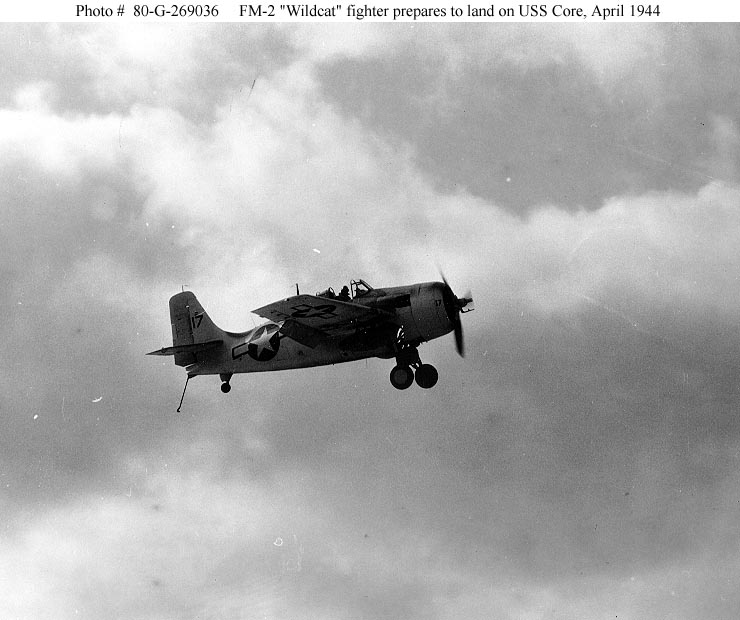 Photo #: 80-G-269036 General Motors FM-2 "Wildcat" fighter Flies near USS Core (CVE-13), during operations in the North Atlantic, 12 April 1944. Plane has its landing gear and tailhook down, in preparation for landing on board. Official U.S. Navy Photograph, now in the collections of the National Archives. Online Image: 64KB; 740 x 620 pixels Reproductions of this image may also be available through the National Archives photographic reproduction system. |