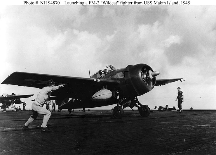 Photo #: NH 94870 FM-2 "Wildcat" fighter Receives the "launch" signal on USS Makin Island (CVE-93), 1945. Courtesy of PHC John Highfill, USN (Retired). U.S. Naval History and Heritage Command Photograph. Online Image: 61KB; 740 x 530 pixels |
