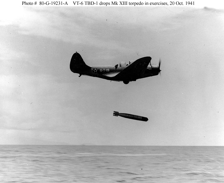 Photo #: 80-G-19236-B Douglas TBD-1 "Devastator" torpedo plane Drops a Mark XIII torpedo during exercises in the Pacific, 20 October 1941. This plane is from Torpedo Squadron Six (VT-6), based on USS Enterprise (CV-6). Official U.S. Navy Photograph, now in the collections of the National Archives. Online Image: 73KB; 740 x 605 pixels Reproductions of this image may also be available through the National Archives photographic reproduction system. |