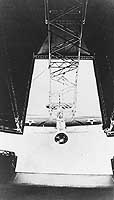 Photo #: NH 77433 USS Macon (ZRS-5) One of the airship's Curtiss F9C-2 "Sparrowhawk" fighters hooking on to her trapeze, during flight operations near Naval Air Station Moffett Field, California, in 1934. Photographed from inside Macon's hangar. The plane's pilot was Lieutenant Harold B. Miller, USN. Courtesy of Harold B. Miller, 1973. U.S. Naval Historical Center Photograph. Online Image: 63KB; 420 x 765 pixels |