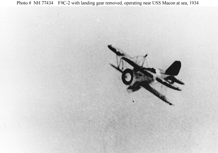 Photo #: NH 77434 Curtiss F9C-2 "Sparrowhawk" fighter, with its landing gear removed Operating at sea with USS Macon (ZRS-5), probably circa 12 October 1934. This image is a frame from a motion picture film, taken from Macon. Courtesy of Harold B. Miller, 1973. U.S. Naval Historical Center Photograph. Online Image: 52KB; 740 x 520 pixels |