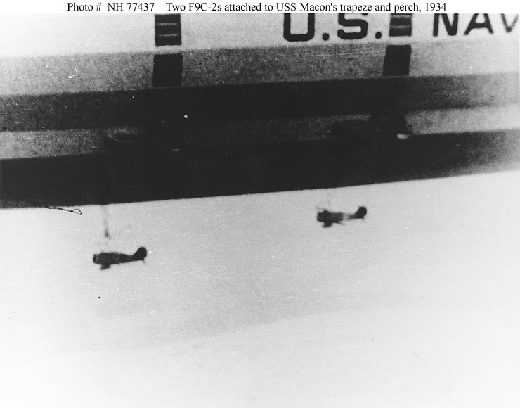 Photo #: 80-G-441979 Curtiss F9C-2 "Sparrowhawk" fighter (Bureau # 9057), piloted by Lieutenant D. Ward Harrigan, USN Hanging from the trapeze of USS Macon (ZRS-5) during flight operations in 1933. Official U.S. Navy Photograph, now in the collections of the National Archives. Online Image: 104KB; 740 x 620 pixels Reproductions of this image may also be available through the National Archives photographic reproduction system. |