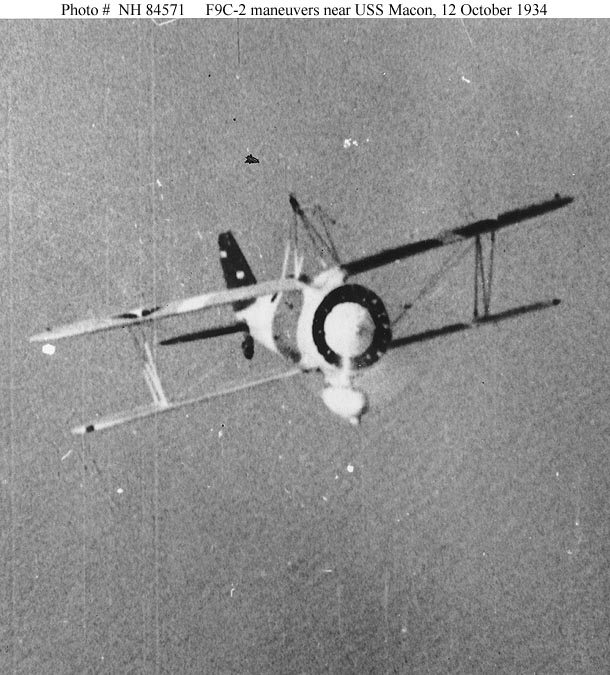 Photo #: NH 84571 Curtiss F9C-2 "Sparrowhawk" fighter, with its landing gear removed for airship operations Maneuvers near USS Macon (ZRS-5), while being filmed by Fox "Movietone News" cameras on 12 October 1934. The plane's pilot was Lieutenant (Junior Grade) Frederick N. Kivette, USN. Courtesy of Richard K. Smith, author of the book "The Airships Akron & Macon", 1974. U.S. Naval Historical Center Photograph. Online Image: 88KB; 610 x 675 pixels |
