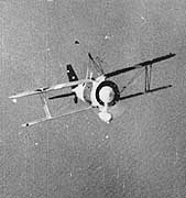 Photo #: NH 77435 Curtiss F9C-2 "Sparrowhawk" fighter, with its landing gear removed Hooking on to the trapeze of USS Macon (ZRS-5), probably circa 12 October 1934. This image is a frame from a motion picture film, taken from Macon's control car. Courtesy of Harold B. Miller, 1973. U.S. Naval Historical Center Photograph. Online Image: 65KB; 740 x 590 pixels |