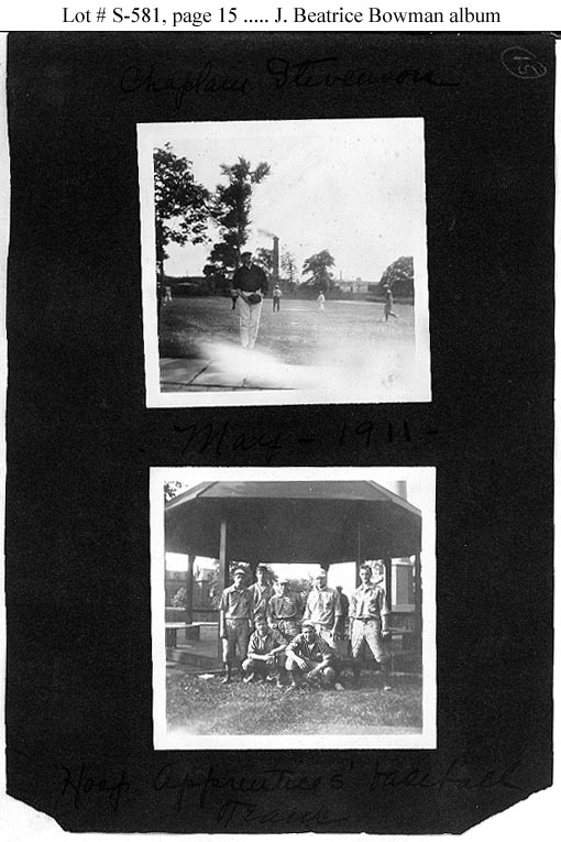 Left: Page 14 Between the photos -- "Dr. Bolan -- May 1911" Note: Assistant Surgeon Micajah Boland was assigned to the Naval Hospital, Philadelphia, in 1911. Right: Page 15 To left of left photo: -- "Chaplain Stevenson" Note: Chaplain George E.T. Stevenson was assigned to the Naval Home, Philadelphia, in 1911. Between the photos: -- "May 1911" To right of right photo: -- "Hosp. Apprentices' Baseball Team" |