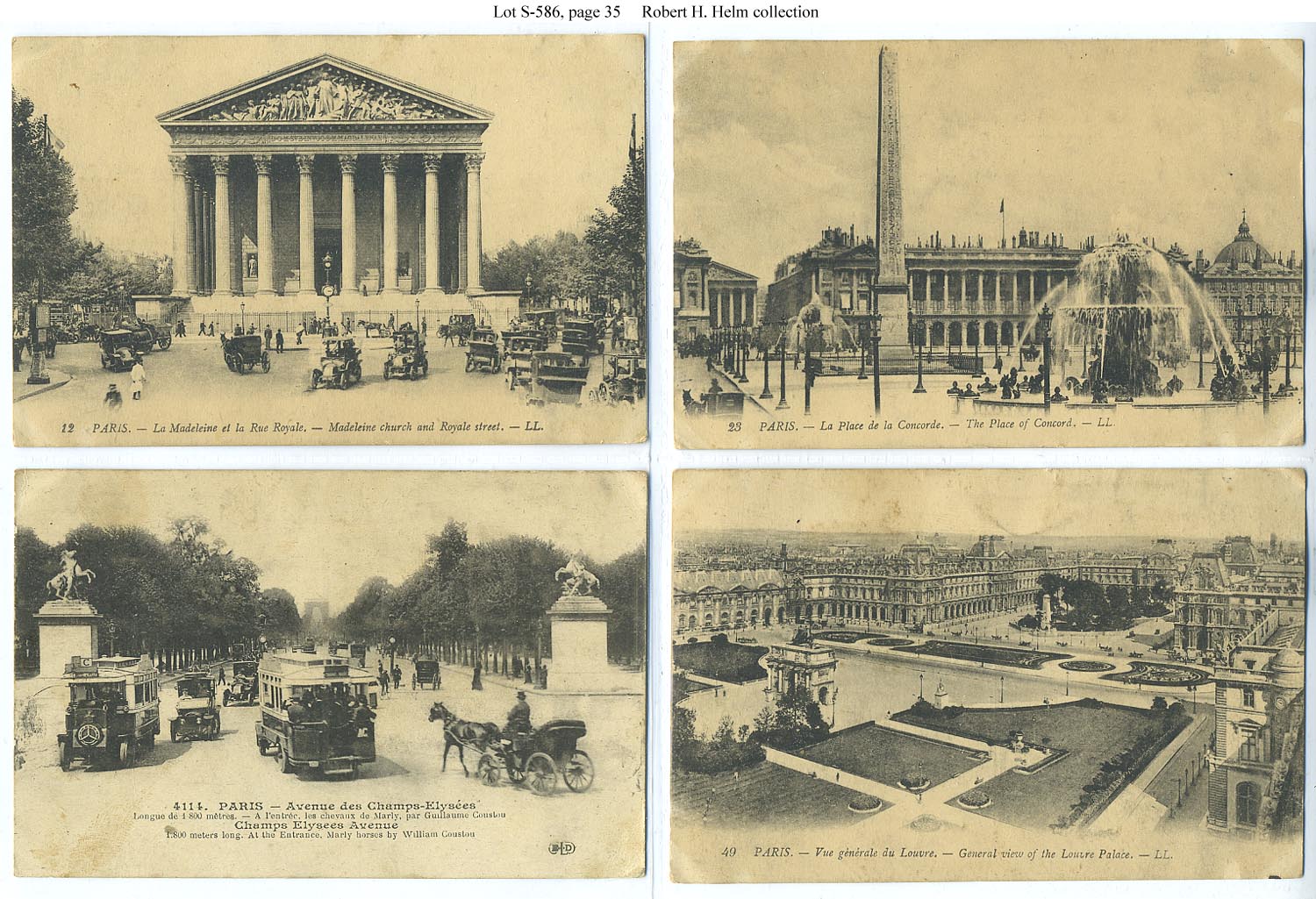 S-586, Page 35: Four commercially produced post cards showing scenes in Paris, France during the 1910s era. Three were published by Levy Fils & Co., Paris. The lower left card was published by Le Deley, Paris. The reverse sides of all four cards bear messages from Robert H. Helm to members of his family in Philadelphia, Pennsylvania.