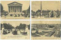 Upper left card: Church of the Madeleine and Rue Royale, with automobiles and horse-drawn carriages.