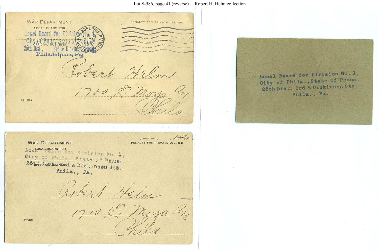 S-586, Page 41: World War I Draft registration and notification cards issued to Robert H. Helm, of Philadelphia, Pennsylvania.