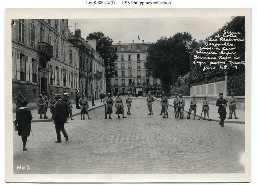 Left: S-589-A(3) -- French Soldiers guarding the Hotel des Reservoirs, Versailles, France a few minutes before the German delegation left to sign the peace treaty ending World War I, 28 June 1919. |