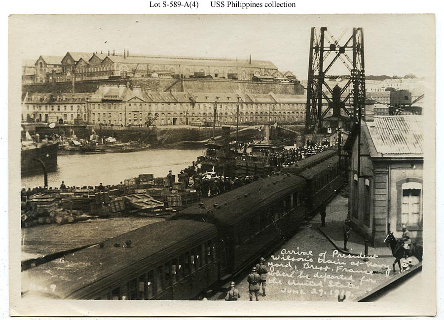 | Left: S-589-A(4) -- Arrival of President Woodrow Wilson's train at Brest dockyard, France, where he departed for the United States after the signing of the Treaty of Versailles, 29 June 1919. |