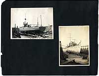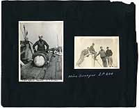 S-591, Page 8 (reverse side of Page 7): -- Upper left photo: Sailor with one of the ship's guns (probably a three-pounder); -- Lower left photo: Sailor standing by the ship's rail; -- Upper center photo: Sailor aloft on the ship's mast; -- Upper right photo: Sailor beside a cable winch. Two other "menhaden fisherman" type minesweepers are in the background; -- Lower right photo: Crew members posing on and by the ship's after deck house. Note: For an individual greyscale reproduction of the lower right photo, see Photo # NH 107068. |