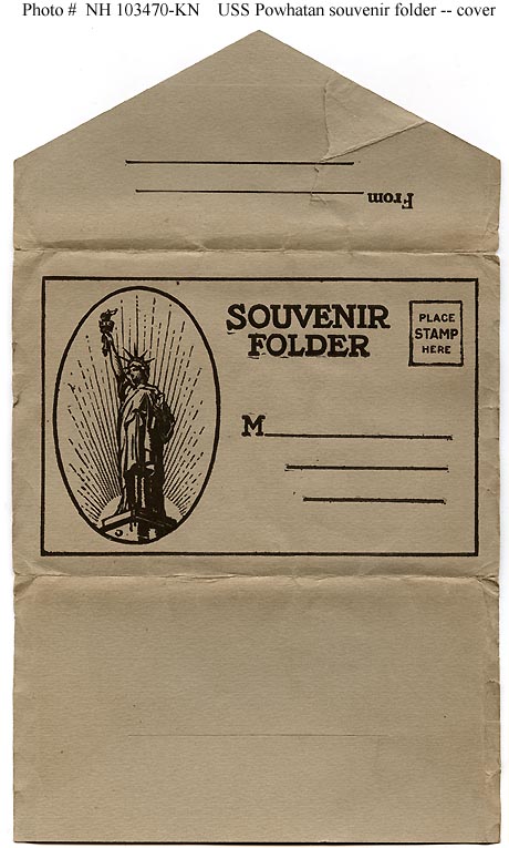 Photo #: NH 103470-KN (color) USS Powhatan (ID # 3013) "Souvenir Folder", published circa 1918-1919 by A.M. Simon, 324 E. 23rd St., New York City, featuring ten halftone reproductions of photographs of and on board the ship. The individual photographs have Photo #s NH 103460, NH 103461, NH 103462, NH 103463, NH 103464, NH 103465, NH 103466, NH 103467, NH 103468, and NH 103469. Donation of Dr. Mark Kulikowski, 2006. U.S. Naval History and Heritage Command Photograph. Online Image: 71KB; 460 x 765 pixels |