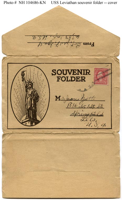 Photo #: NH 104686-KN (color) USS Leviathan (ID # 1326) "Souvenir Folder" published in 1919, featuring ten halftone reproductions of photographs of and on board the ship. It appears to have been mailed home to Springfield, Illinois, by a U.S. Army Private who was a passenger on the ship in 1919. The individual photographs in this "Souvenir Folder" have Photo #s NH 104687, NH 104688, NH 104689, NH 104690, NH 104691, NH 104692, NH 104693, NH 104694, NH 104695, and NH 104696. Donation of Dr. Mark Kulikowski, 2007. U.S. Naval Historical Center Photograph. Online Image: 69KB; 465 x 765 pixels |