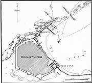 Photo #: NH 56745 Burning of the frigate Philadelphia in Tripoli harbor, 16 February 1804 Chart by Charles Wellington Furlong, 1904, depicting (by dot and dash lines) the course followed by the ketch Intrepid, under Lieutenant Stephen Decatur, as she entered and left Tripoli harbor on her mission to destroy the captured USS Philadelphia. Heavy dashed line indicates Philadelphia's drift after she was set afire. Position "A" marks Philadelphia's position when boarded by Decatur's men, while "B" is the location of her wreck when Furlong located it about a century later and recovered artifacts. Position "X" (just west of the Jerba Passage) is the location of Intrepid's wreck after she blew up on 4 September 1804, during another mission into Tripoli harbor. Courtesy of Charles Wellington Furlong, July 1939. U.S. Naval Historical Center Photograph. Online Image: 115KB; 690 x 650 pixels |