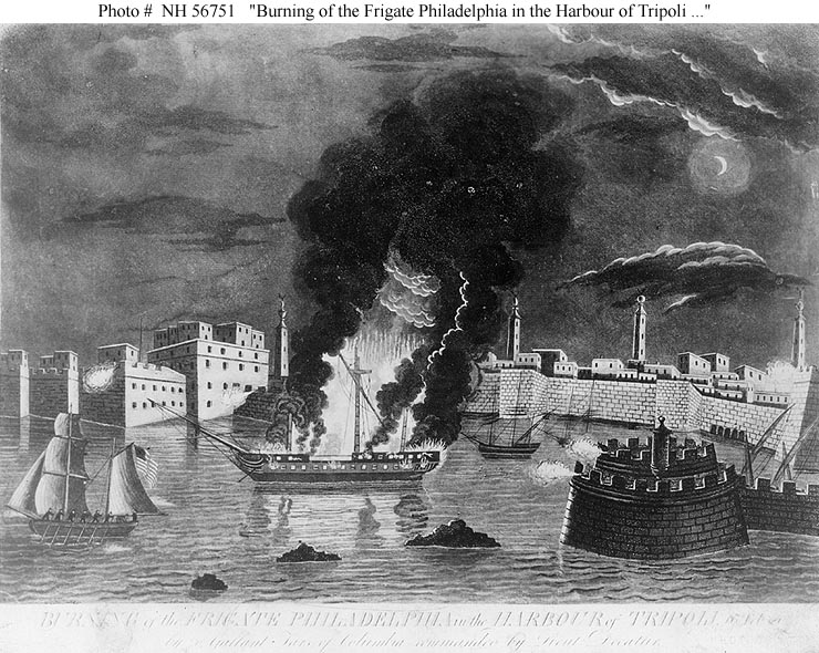 Photo #: NH 56735 Destruction of USS Philadelphia in Tripoli harbor, 16 February 1804 Artwork from the collection of Mr. Stephen Decatur, depicting Philadelphia afire after she was boarded and set ablaze by a party led by Lieutenant Stephen Decatur. In the left foreground is the ketch Intrepid, which Decatur used during this mission. U.S. Naval Historical Center Photograph. Online Image: 119KB; 740 x 610 pixels |