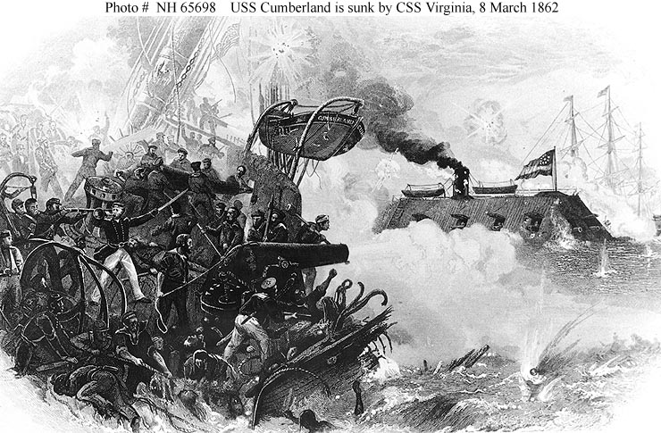 Photo #: NH 65698 Sinking of USS Cumberland by CSS Virginia, 8 March 1862 Line engraving published in "Leslie's Weekly", circa 1862, depicting the scene on board the Cumberland as she went down off Newport News, Virginia, with her crew still firing on the Confederate ironclad. U.S. Naval Historical Center Photograph. Online Image: 138KB; 740 x 485 pixels |