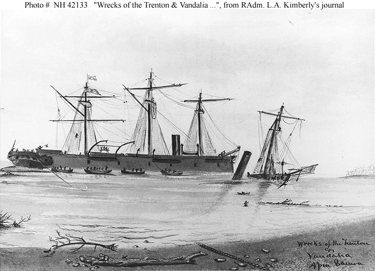 "The Nipsic beached, wrecks of Trenton & Vandalia astern."