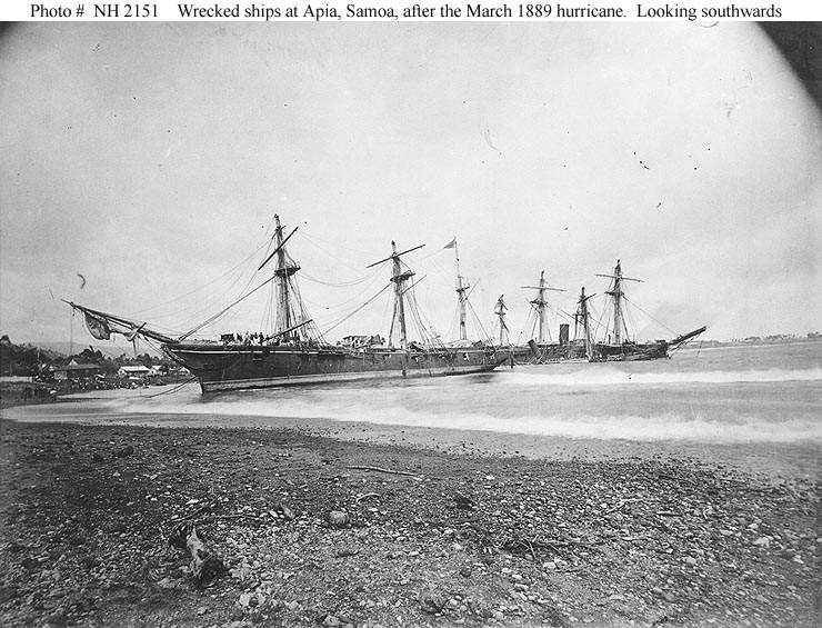 On the 15th and 16th of March 1889, a tropical hurricane (as most of its contemporaries called it ... modern people might prefer the term "typhoon") struck the South Pacific island kingdom of Samoa. In the port of Apia, on the northern coast of the Samoan island of Upolu, seven foreign warships were anchored in the town's small and very exposed harbor, protecting their national interests during a time of domestic Samoan political unrest. Active German military involvement in the local crisis was perceived as a threat to U.S. commerical interests in the islands, and the U.S. Navy's Pacific Station flagship, USS Trenton, and the smaller U.S. warships Vandalia and Nipsic were present as a "show of force" in opposition to the German corvette Olga and gunboats Adler and Eber. This tense situation carried a serious risk of war between those two countries. Also anchored in Apia harbor was the British Royal Navy corvette Calliope and several civilian vessels.