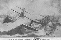 Note: In addition to the views referenced above, the National Maritime Museum in Greenwich, England, holds several artworks that depict scenes before and during the Apia hurricane of 15-16 March 1889. Among these are: National Maritime Museum photo # 7746 -- Oil painting by a German artist depicting the warships at anchor in Apia harbor shortly before the storm. National Maritime Museum photo # 7747 -- Oil painting by a German artist depicting the warships in distress amid towering waves at the height of the storm. National Maritime Museum photo # 58/6603 -- Engraving from a contemporary publication, depicting the ships at the height of the storm, with some of them being driven onto the reefs. This view has a heavy vertical line in its center. National Maritime Museum photo # 2959 -- Etching by W.L. Wyllie, depicting HMS Calliope steaming out of Apia Harbor into the teeth of the hurricane. The view shows Calliope from off her stern (somewhat to the port side), with another ship (probably USS Trenton) beyond. National Maritime Museum photo # 58/6590 -- Engraving from the "Illustrated London News", depicting the crew of USS Trenton cheering HMS Calliope as she steamed seaward at the peak of the hurricane. The artist's vantage point is from on board Trenton, with Calliope passing nearby (seen from off her port quarter). National Maritime Museum photo # A.8339 -- Painting showing HMS Calliope escaping from Apia Harbor during the storm. The view shows Calliope from off her starboard side, with a huge wave breaking amidships.