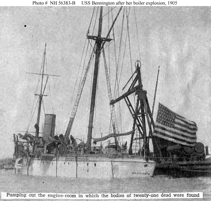 Photo #: NH 56383-B USS Bennington (Gunboat # 4) Halftone reproduction of a photograph, showing the ship as her engine room was being pumped out, soon after her 21 July 1905 boiler explosion at San Diego, California. Note her National Ensign flying at half-staff. Donation of Rear Admiral Ammen Farenholt, USN (Medical Corps), November 1931. U.S. Naval Historical Center Photograph. Online Image: 102KB; 690 x 660 pixels |