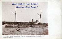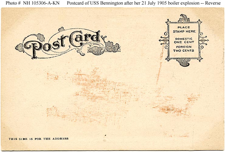 Photo #: NH 105306-A-KN (color) USS Bennington (Gunboat # 4) Reverse of a postcard published circa mid-1905 by Sewards' Post Cards, Los Angeles, California, commemorating the 21 July 1905 boiler explosion that killed many of USS Bennington's crew members. For a view of the front of the original postcard, featuring a photograph of Bennington taken shortly after the tragedy, see: Photo # NH 105306-KN. Courtesy of Harrell E. ("Ed") Coffer, 2007. U.S. Naval Historical Center Photograph. Online Image size: 88KB; 740 x 500 pixels |