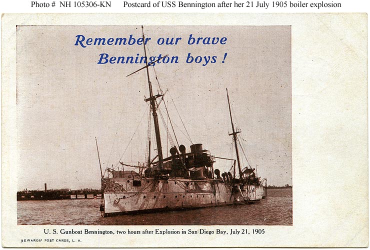 At about 10:30 a.m. on 21 July 1905 the gunboat Bennington suffered one of the Navy's worst peacetime disasters. She had arrived at San Diego, California, just two days earlier, after a difficult seventeen-day voyage from the Hawaiian Islands. Though both the ship and her men could have used a rest, they were soon ordered back to sea to assist the monitor Wyoming, which had broken down and needed a tow.