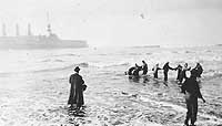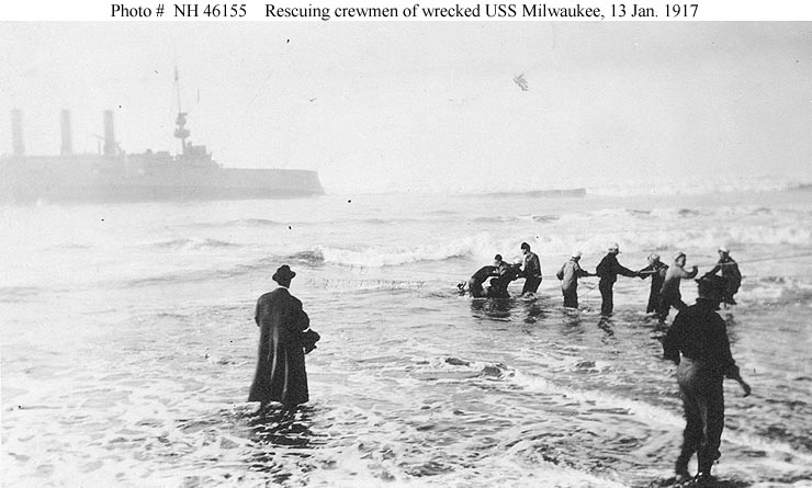 The stranding of USS Milwaukee, not unexpected by those familar with local conditions, brought a large crowd to Samoa Beach, both to spectate and to help. As the fog lifted in mid-morning on 13 January 1917, it was clear that extensive work would be needed to rescue the cruiser's crew. Initially, a line rigged from ship to shore brought men ashore by breeches buoy -- a slow process that subjected its passengers to frequent dunkings as the ship's rolling tightened and loosened the line. Two surfboats were then put to use, manned by volunteers from among the onlookers. Assisted by gradually moderating surf, work continued until evening, when all on board the Milwaukee were safely ashore.