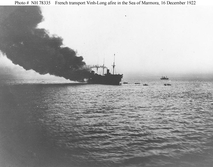 In the early morning of 16 December 1922, the U.S. Navy destroyer Bainbridge (DD-246) was steaming through the Sea of Marmora, Turkey, en route to Constantinople. At 6:38 AM her crew noticed flames on the stern of the elderly French military transport Vinh-Long, which was some five miles astern, also bound for Constantinople. Bainbridge's Commanding Officer, Lieutenant Commander Walter A. Edwards, immediately headed his ship toward the burning Vinh-Long, arriving about twelve minutes later. At the time it appeared that the French transport's crew would contain the blaze, but Edwards put his boats in the water and stood by as a precaution.