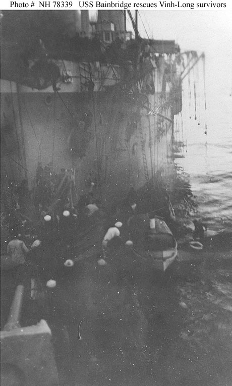 About five minutes after Bainbridge came on the scene an explosion took place on Vinh-Long and the flames began to spread. Many of those on board jumped overboard, and others started to panic. Bainbridge quickly moved to place her bow against that of the burning transport so that the hundreds of people gathered on her bow could slide down lines to the American destroyer. Shortly after that, a very powerful explosion blew the transport's mainmast over the side and the fire intensified. Amid greatly increased danger and confusion, the evacuation continued until all on board the Vinh Long had reached the Bainbridge or gotten into the water. In keeping with the traditions of the sea, the French ship's Captain was the last to leave. The destroyer then pulled away to avoid the risk that Vinh-Long's forward magazine might also explode.