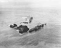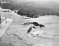 USS Nicholas (DD-311), beyond the rocks in the center;