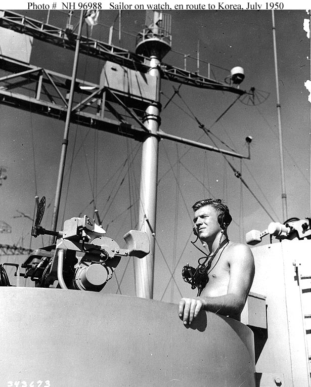Photo #: NH 96988 USS Mount McKinley (AGC-7) Gunner's Mate stands watch in the ship's after port side Mk.51 gun director tub, while at sea en route to land First Cavalry Division troops at Pohang, South Korea, 18 July 1950. This view looks forward, with the ship's after mast visible beyond the director tubs. Note: Communications headset and details of Mk.51 directors. Official U.S. Army Photograph, from the "All Hands" collection at the Naval Historical Center. Online Image: 106KB; 615 x 765 pixels |