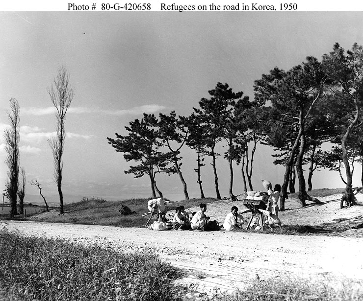 Photo #: 80-G-420658 Korean refugees On the road, probably in the Pohang area in October 1950. Note hand-barrows used to carry their belongings. Official U.S. Navy Photograph, now in the collections of the National Archives. Online Image: 144KB; 740 x 615 pixels Reproductions of this image may also be available through the National Archives photographic reproduction system. |