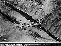 Photo #: 80-G-687603 "Carlson's Canyon" Bridge Attacks, March-April 1951 Photograph "Carlson's Canyon # 8", showing the situation on 17 March 1951, with a new stock of wooden ties collected in the ravine for reconstruction of the bridge. It had been hit by a 4th set of carrier air strikes on 15 March, destroying reconstruction work done after the bridge was originally knocked out by strikes on 3 March. This railway bridge-tunnel complex was located south of Kilchu, in northeastern Korea. Official U.S. Navy Photograph, now in the collections of the National Archives. Online Image: 157KB; 740 x 535 pixels Reproductions of this image may also be available through the National Archives photographic reproduction system. |