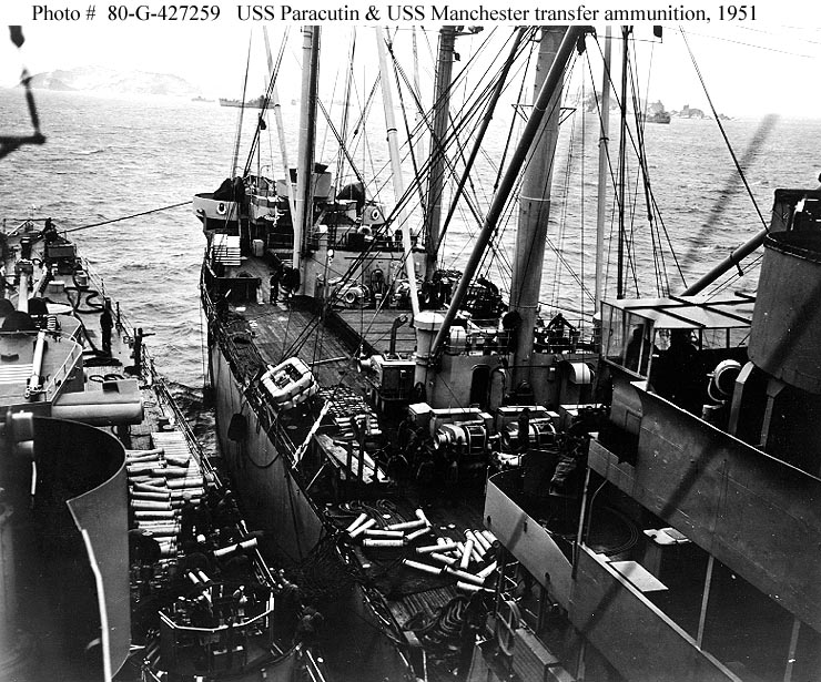 Photo #: 80-G-427259 USS Paricutin (AE-18), at right Resupplying USS Manchester (CL-83) with ammunition, in Wonsan Harbor, North Korea. Photograph is dated 12 March 1951. Official U.S. Navy Photograph, now in the collections of the National Archives. Online Image: 159KB; 740 x 615 pixels Reproductions of this image may also be available through the National Archives photographic reproduction system. |