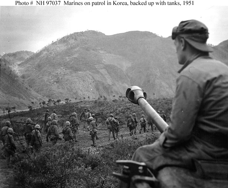Photo #: NH 97037 U.S. Marines on patrol in Korea A crewman watches from a M-26 tank supporting patrolling Marines as they advance through mountainous Korean terrain. Photo is dated 23 April 1951. Official U.S. Navy Photograph, from the "All Hands" collection at the Naval Historical Center. Online Image: 79KB; 740 x 610 pixels |