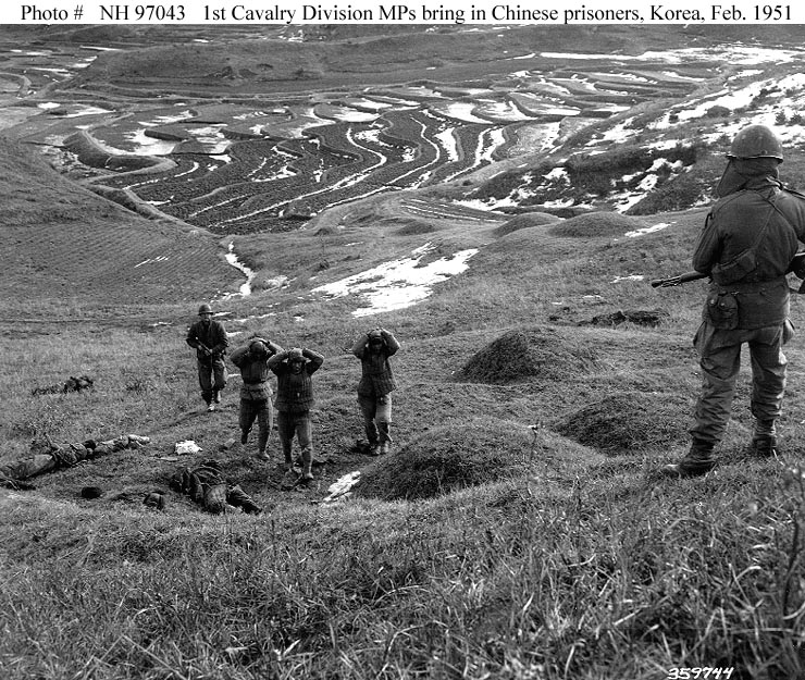 Photo #: NH 97043 Chipyang, Korean Members of the 545th MP Company, 1st Cavalry Division, bring in three Chinese Communists at Chipyang, Korea, 27 February 1951. Soldier at right is holding an M1C sniper rifle. The man driving the prisoners has a Thompson submachine gun. There are several apparently dead Chinese at the left. Official U.S. Army Photograph, from the "All Hands" collection at the Naval Historical Center. Online Image: 188KB; 740 x 625 pixels |
