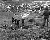Photo #: SC 357227 Korean War Ground Combat Personnel of Companies A and K, 35th Infantry Regiment, keep a sharp lookout for movement in the Communist-held area in the background, as U.N. forces bombard the vicinity with white phosphorous shells. Photograph is dated 1 February 1951. Photograph from the Army Signal Corps Collection in the U.S. National Archives. Online Image: 113KB; 740 x 605 pixels Reproductions of this image may also be available through the National Archives photographic reproduction system. |