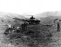 Photo #: NH 97198 Korean War Helicopter Medical Evacuation, 1951 "Navy corpsmen prepare three Marines wounded at Kari San Mountain for evacuation by helicopter to a rear area hospital, 23 May 1951." (quoted from original caption) Helicopter is a Marine Corps Sikorski HO3S. Official U.S. Navy Photograph, from the "All Hands" collection at the Naval Historical Center. Online Image: 115KB; 740 x 595 pixels |