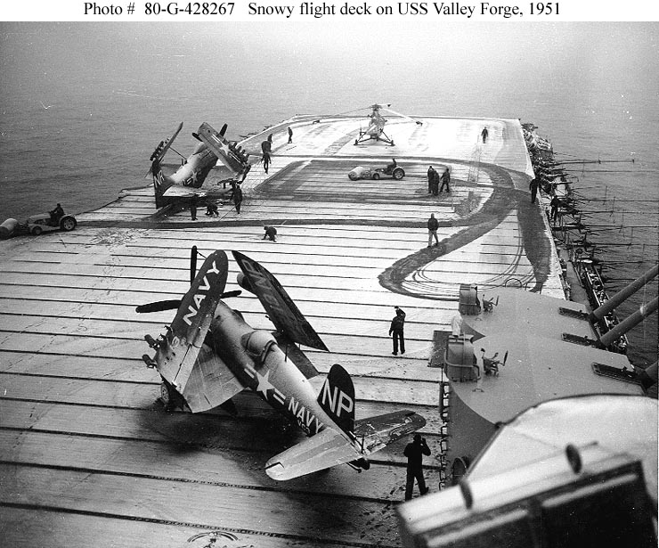 Photo #: 80-G-428267 USS Valley Forge (CV-45) Crewmen use flight deck tractors with power brooms to sweep snow from the carrier's flight deck, during operations off Korea, circa early 1951. Photo is dated 8 May 1951, but Valley Forge ended her second Korean War deployment in late March of that year. Plane parked in the foreground is a F4U-4 "Corsair" fighter. Those on the forward flight deck are an AD "Skyraider" attack plane and a HO3S helicopter. Official U.S. Navy Photograph, now in the collections of the National Archives. Online Image: 128KB; 740 x 615 pixels Reproductions of this image may also be available through the National Archives photographic reproduction system. |