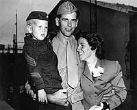 Photo #: 80-G-434458-A Staff Sergeant Phillip Korei, USMC Rejoins his wife and son, Phillip, Jr., after months of separation, at Treasure Island, California, 26 September 1951. He returned to the U.S. on the USS General William Mitchell (AP-114), under the Korean War rotation plan. Note miniaturized Marine uniform worn by Phillip, Jr. Official U.S. Navy Photograph, now in the collections of the National Archives. Online Image: 100KB; 740 x 620 pixels Reproductions of this image may also be available through the National Archives photographic reproduction system. |