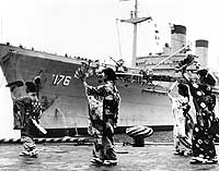 Photo #: 80-G-441050 USS General J. C. Breckinridge (AP-176) Is greeted by Japanese Geisha as she arrives at Yokohama Army Port with Servicemen's dependents on board, 29 March 1952. Photographed by AF2 Myles E. Vallejo. Official U.S. Navy Photograph, now in the collections of the National Archives. Online Image: 105KB; 740 x 605 pixels Reproductions of this image may also be available through the National Archives photographic reproduction system. |