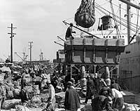 Photo #: 80-G-441385 Pusan, South Korea Korean longshoremen unloading grain from a merchant ship at Pusan port. Photo is dated 2 April 1952. Official U.S. Navy Photograph, now in the collections of the National Archives. Online Image: 141KB; 740 x 610 pixels Reproductions of this image may also be available through the National Archives photographic reproduction system. |