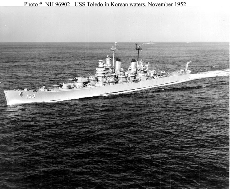 Photo #: NH 96902 USS Toledo (CA-133) Underway in Korean waters, with a battleship and a destroyer in the right distance. The original photo is dated 2 November 1952. Official U.S. Navy Photograph, from the collections of the Naval Historical Center. Online Image: 112KB; 740 x 610 pixels |