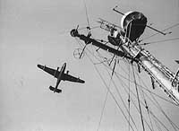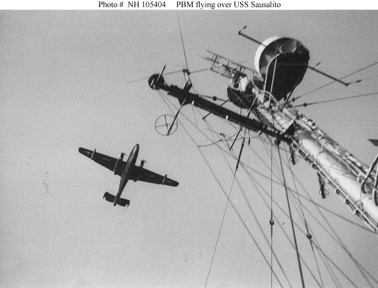 Photo #: NH 105404 USS Sausalito (PF-4) A PBM "Mariner" patrol plane flies above the ship's mast, during operations in the Japan-Korea area, circa 1952. Photographed by James Edward Taylor, who was then a member of Sausalito's crew. Collection of James Edward Taylor. Courtesy of his wife, Mary A. Taylor, 2007. U.S. Naval Historical Center Photograph. Online Image size: 62KB; 740 x 565 pixels |