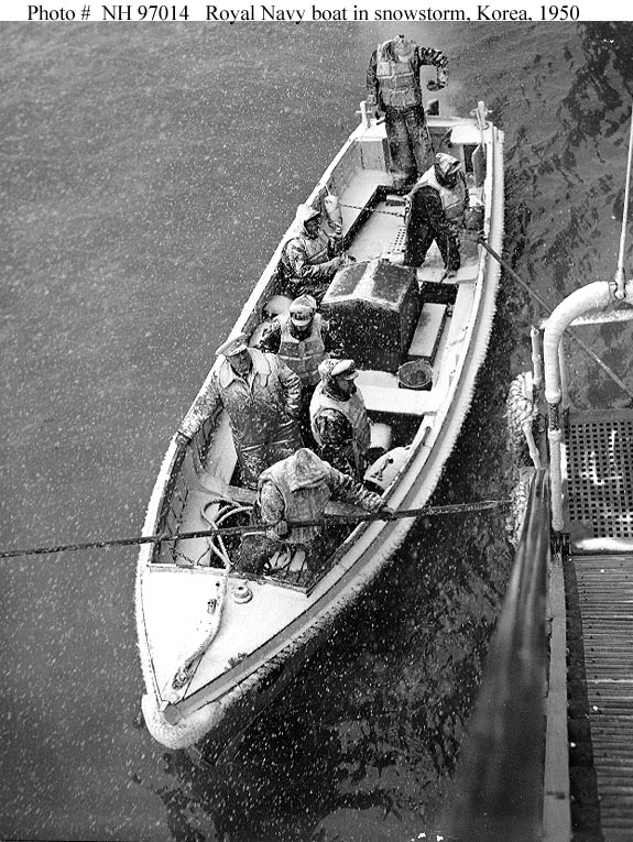 Photo #: NH 97014 Evacuation of Inchon, Korea, December 1950-January 1951 A launch from HMS Kenya comes alongside USS Eldorado (AGC-11), as a snow storm sweeps through Inchon harbor. Eldorado was command ship for the evacuation of United Nations' forces and supplies from Inchon. Kenya provided gunfire support for the operation. The original photograph was released by Commander, Naval Forces, Far East, and is dated 22 December 1950. Official U.S. Navy Photograph, from the "All Hands" collection at the Naval Historical Center. Online Image: 150KB; 575 x 765 pixels |