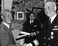 Photo #: 80-G-442097 Syngman Rhee, President of the Republic of Korea, (left) Presents the ROK Order of Military Merit (Taiguk), to Rear Admiral Ralph A. Ofstie, USN, Commander Task Force 77, in ceremonies at the Presidential residence in Pusan, Korea. Also present, in center, is the ROK Chief of Naval Operations, Vice Admiral Sohn Won Il. Photo is dated 13 May 1952. Official U.S. Navy Photograph, now in the collections of the National Archives. Online Image: 97KB; 740 x 620 pixels Reproductions of this image may also be available through the National Archives photographic reproduction system. |