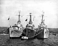 Photo #: NH 97046 Destroyers of British Commonwealth Navies Tied to a mooring bouy at a southern Japanese port (presumably Sasebo), after "an extended period of operations in Korean waters", circa May 1951. The ships are (from left): HMAS Warramunga (Australian Destroyer, 1942); HMCS Nootka (Canadian Destroyer, 1946) and HMS Cockade (British Destroyer, 1945). All three are assigned to the United Nations Blockading and Escort Force, commanded Rear Admiral Allan E. Smith, USN. This photograph was released by Commander, Naval Forces Far East on 19 May 1951. Official U.S. Navy Photograph, from the "All Hands" collection at the Naval Historical Center. Online Image: 156KB; 740 x 615 pixels |