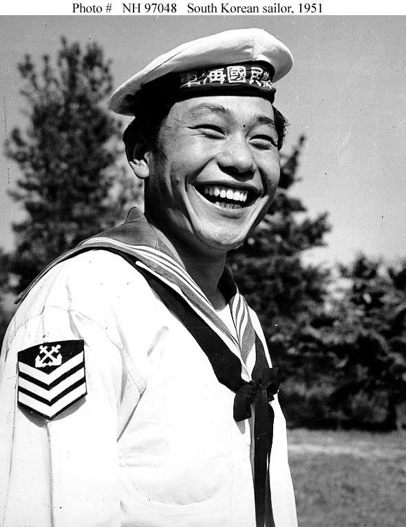 Photo #: NH 97048 "The ROKs Have a Fighting Navy" "The Republic of Korea has a Navy of approximately 50 ships and ten thousand officers and men. Whatever the ROKs lack in numbers they more than make up for in fighting spirit. To the ROKs falls the lion's share of the close-inshore patrol and blockade of the long Korean coastline, a job that calls for their shallow draft craft and their aggressive sailors. Commando and behind-the-lines operations are a day in and day out job of the ROK Navy and Marine Corps. Patterned after U.S. Navy organization, the ROK Navy - man for man and ship for ship - compares favorably with any in the world." "Typical of the ROK Navy man is Hyun Moo Sup, gunner's mate first class, now on duty at the Chinhae naval reservation training other gunner's mate strikers." This photograph and caption were released by Commander, Naval Forces Far East under date of 18 June 1951. Official U.S. Navy Photograph, from the "All Hands" collection at the Naval Historical Center. Online Image: 92KB; 590 x 765 pixels |
